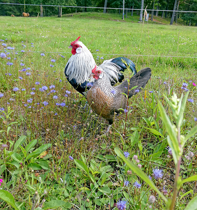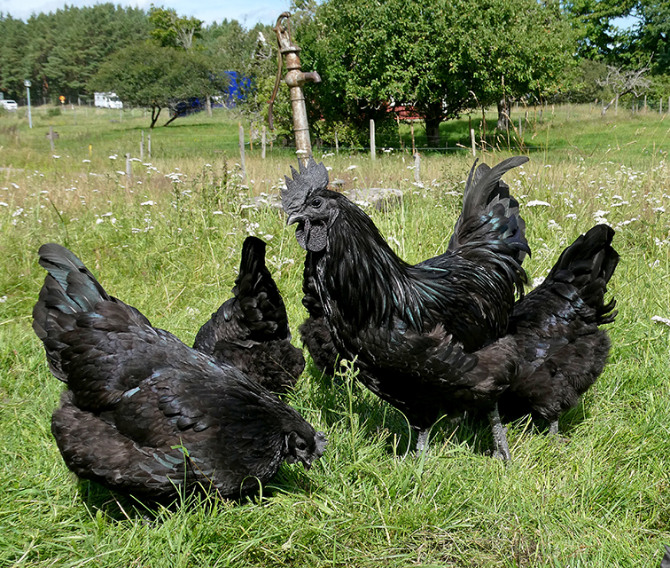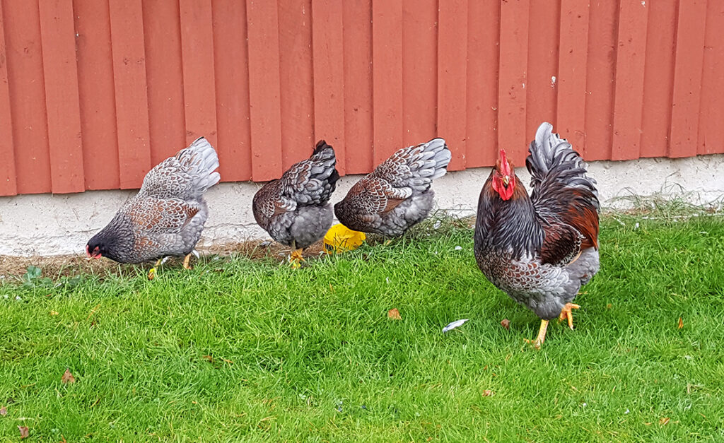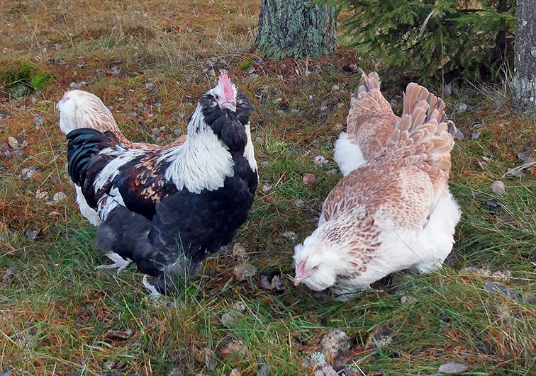 För en sådär 40 år sedan, när vi nyligen flyttat hit och ladugården var nybyggd, funderade vi över vad vi ville skaffa för djur. Vi gjorde en lista över de djurslag vi tidigare haft eller som vi tyckte verkade roliga och markerade sen med plus eller minus i marginalen för deras fördelar och nackdelar. Det djurslag som fick flest plus i kanten var höns!